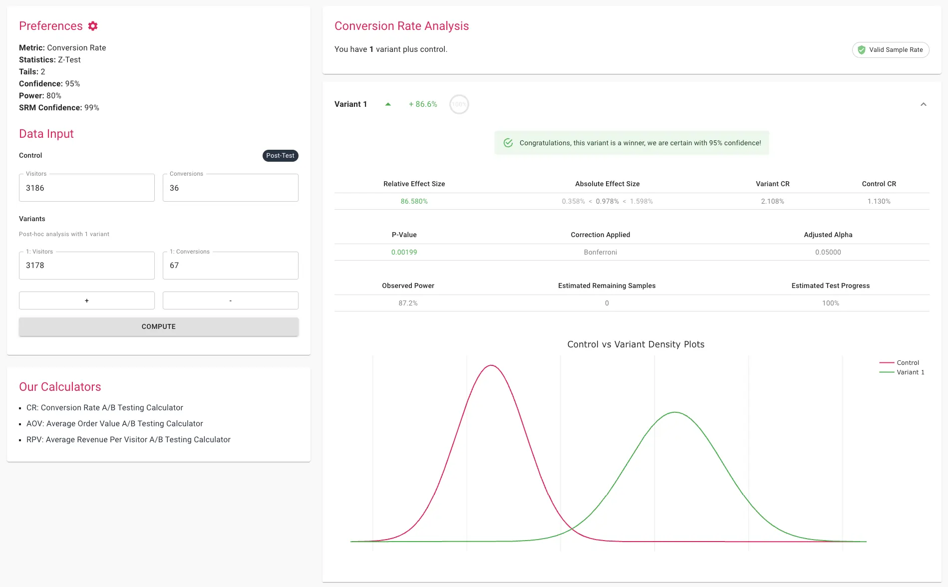Plan tests with A/B testing calculators and determine the expected test duration before you begin. Know the required sample size and statistical power as well to protect your tests and stop exactly when you should.
