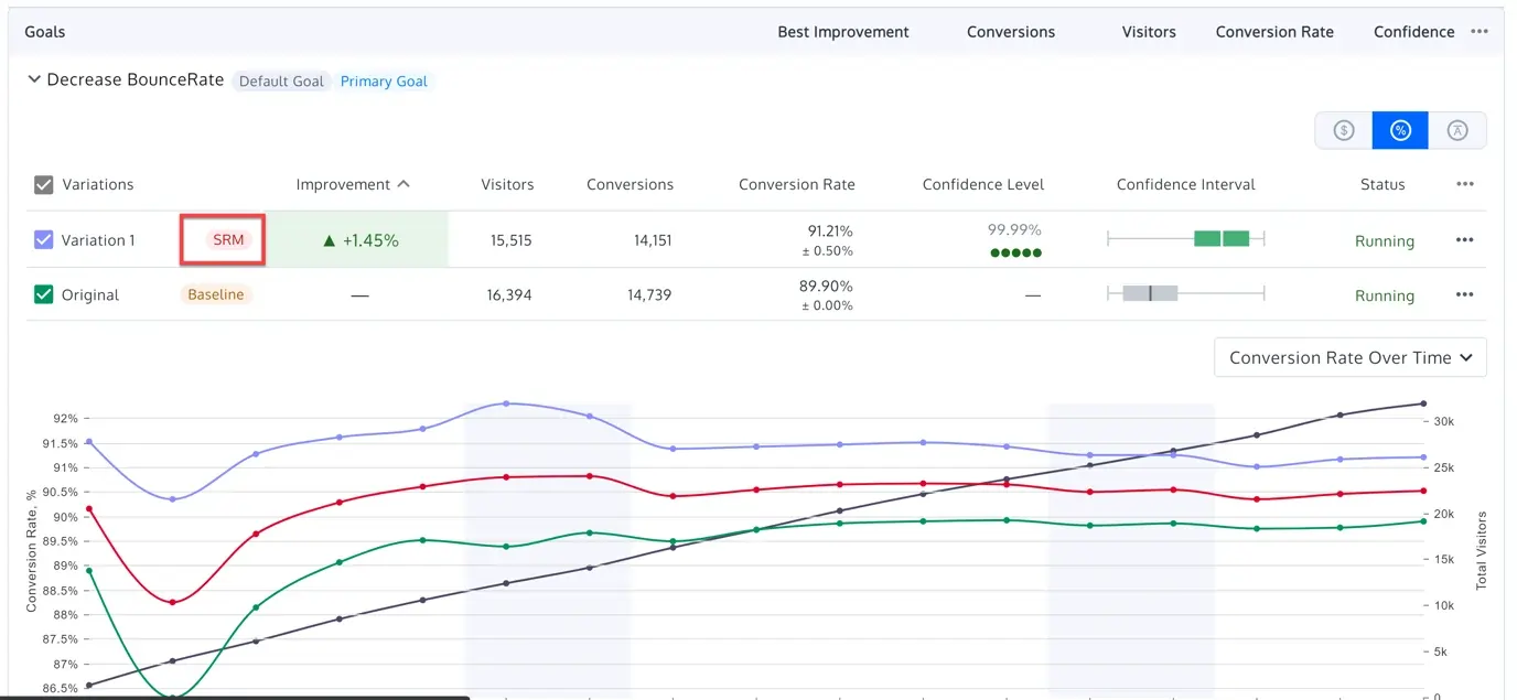 This can happen due to tracking issues, redirect problems, or bot filtering. Convert includes a built-in SRM check (using a Chi-square goodness-of-fit test at 99% confidence) that you can enable in your Project Configuration.