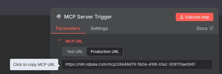 To test the MCP Server Trigger, execute the server, enter a search, and you should see some results. Once verified, copy the Production URL:
