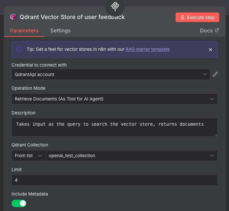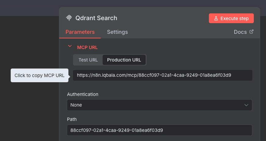In the same workspace, add a new MCP Server trigger. Leave settings as default. Then, for the tool, add the "Qdrant Vector Store" tool. Here's what to use for the settings: