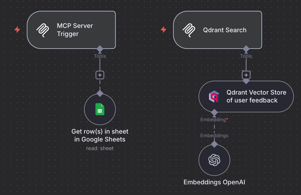 And that's it! Here's what the final n8n workspace should look like (I renamed the new server trigger to read: "Qdrant Search"):
