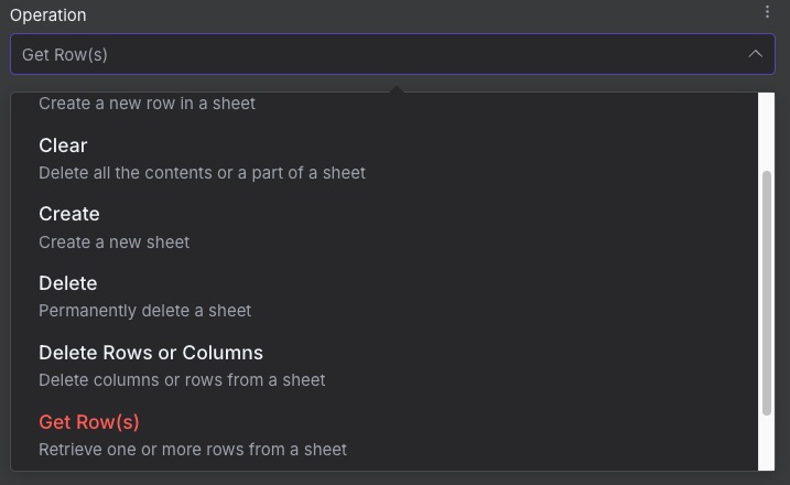 By default, the Sheets node is set to "Get row(s) in sheet in Google Sheets". There are other "Operations" we can run besides getting row data:
